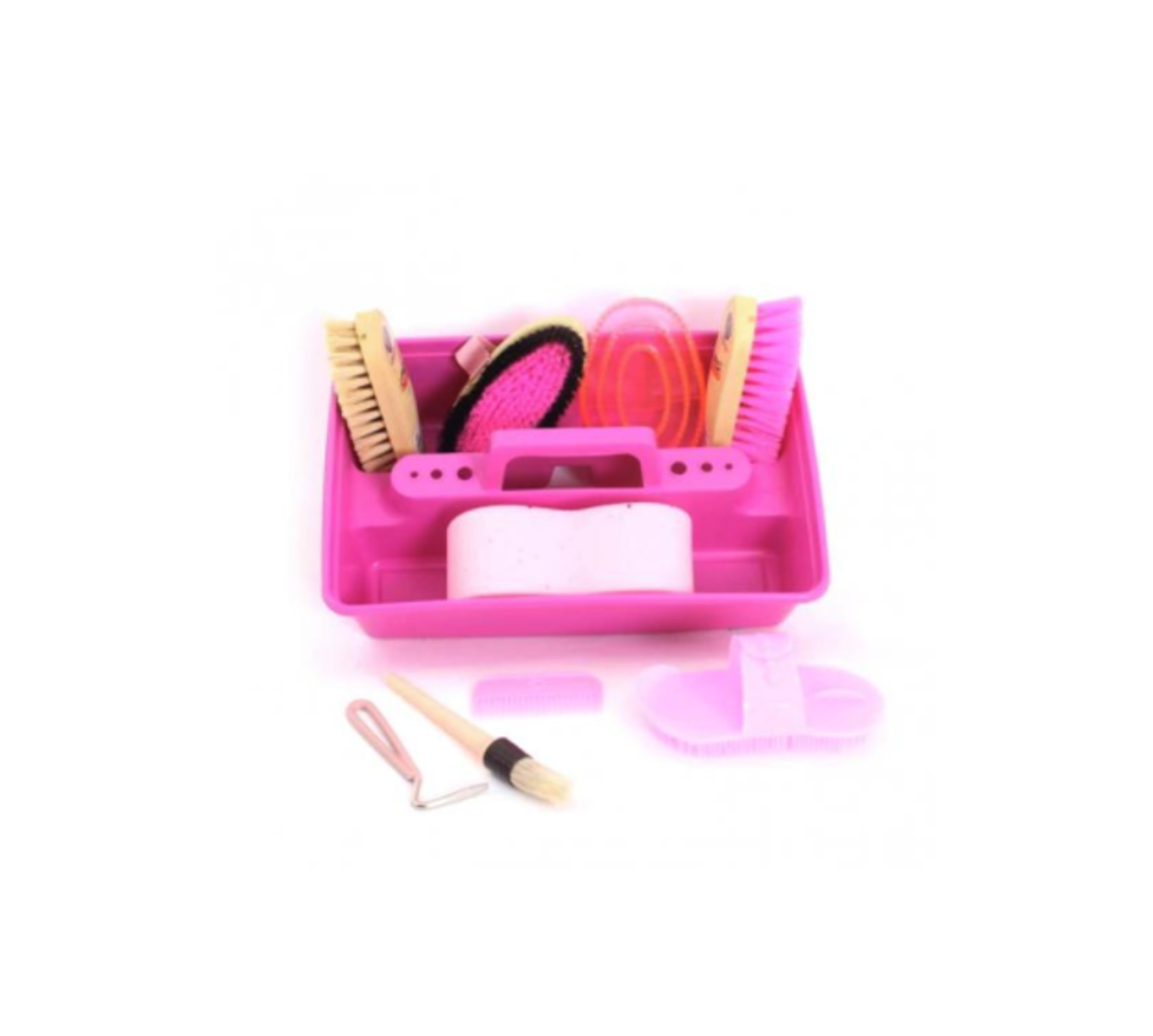 Contains a Body Brush, Dandy Brush, Hoof Oil Brush, Dog Bone Sponge, Hoof Pick, Mane Comb, Plastic Curry Comb, and a Synthetic Curry Comb. Available in Pink or Blue to suit your horse!