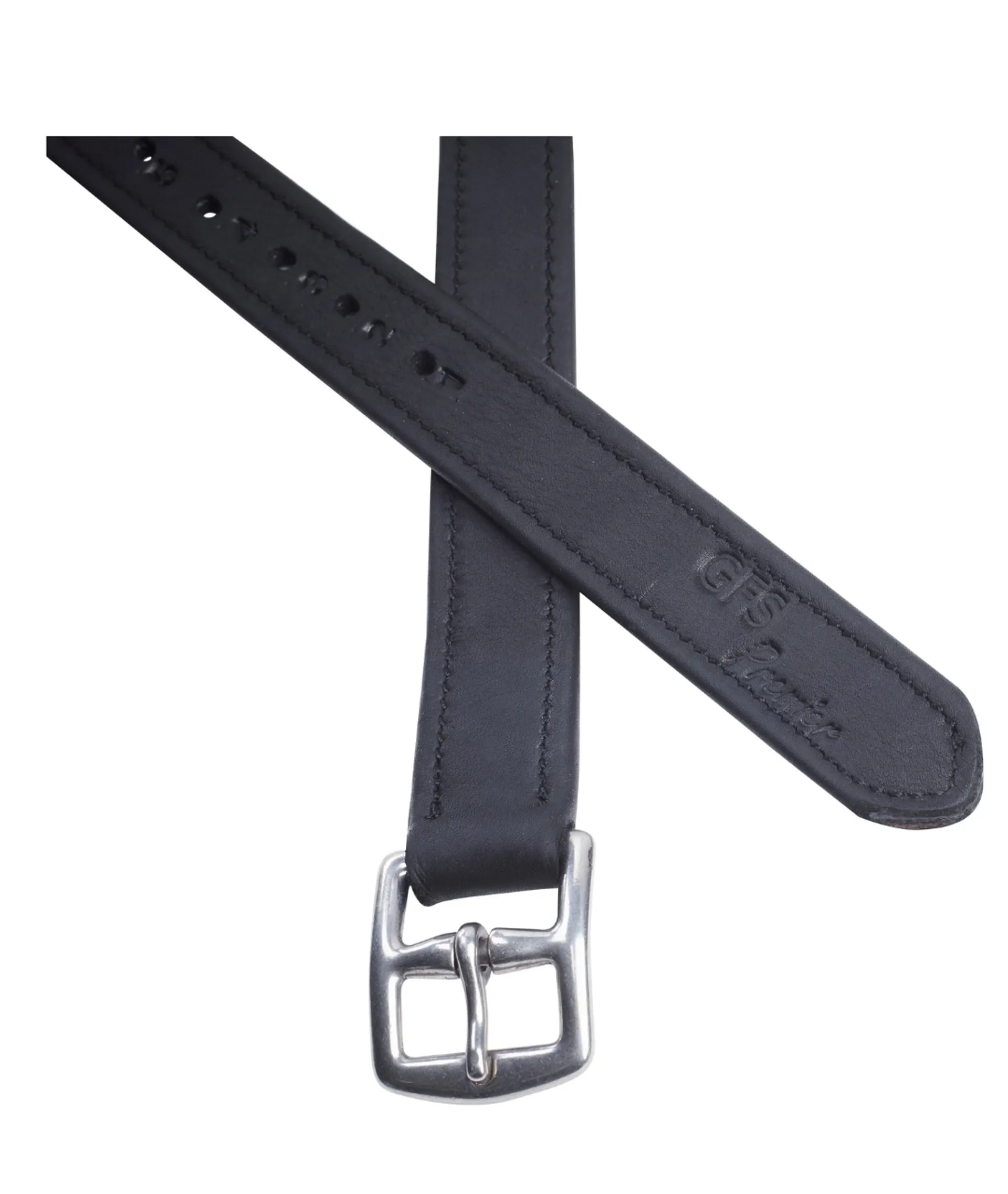 GFS CALF finished stirrup leatherwith inner nylon core for both STRENGTH and to minimize stretch. Hole placement is closer than TRADITIONAL leathers to enable better ADJUSTMENT of leg length and also to give a wider range of adjustment. Features CURVED BUCKLES which wraps around the stirrup bar and REDUCES bulk under the leg.